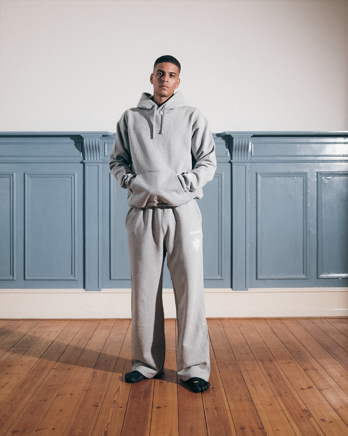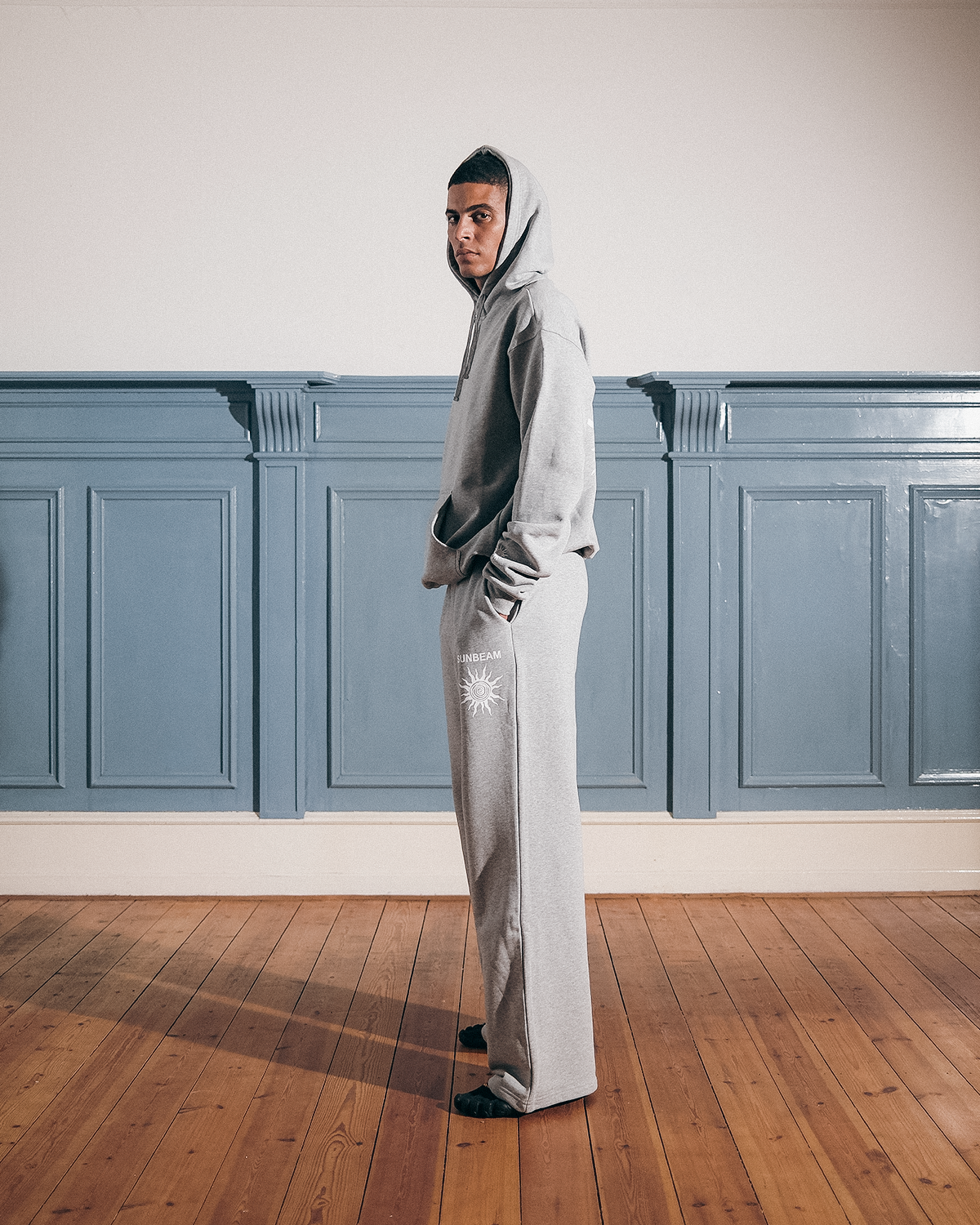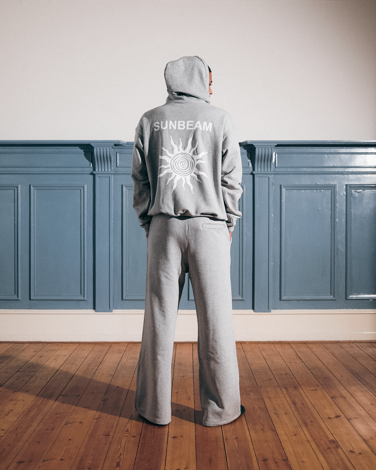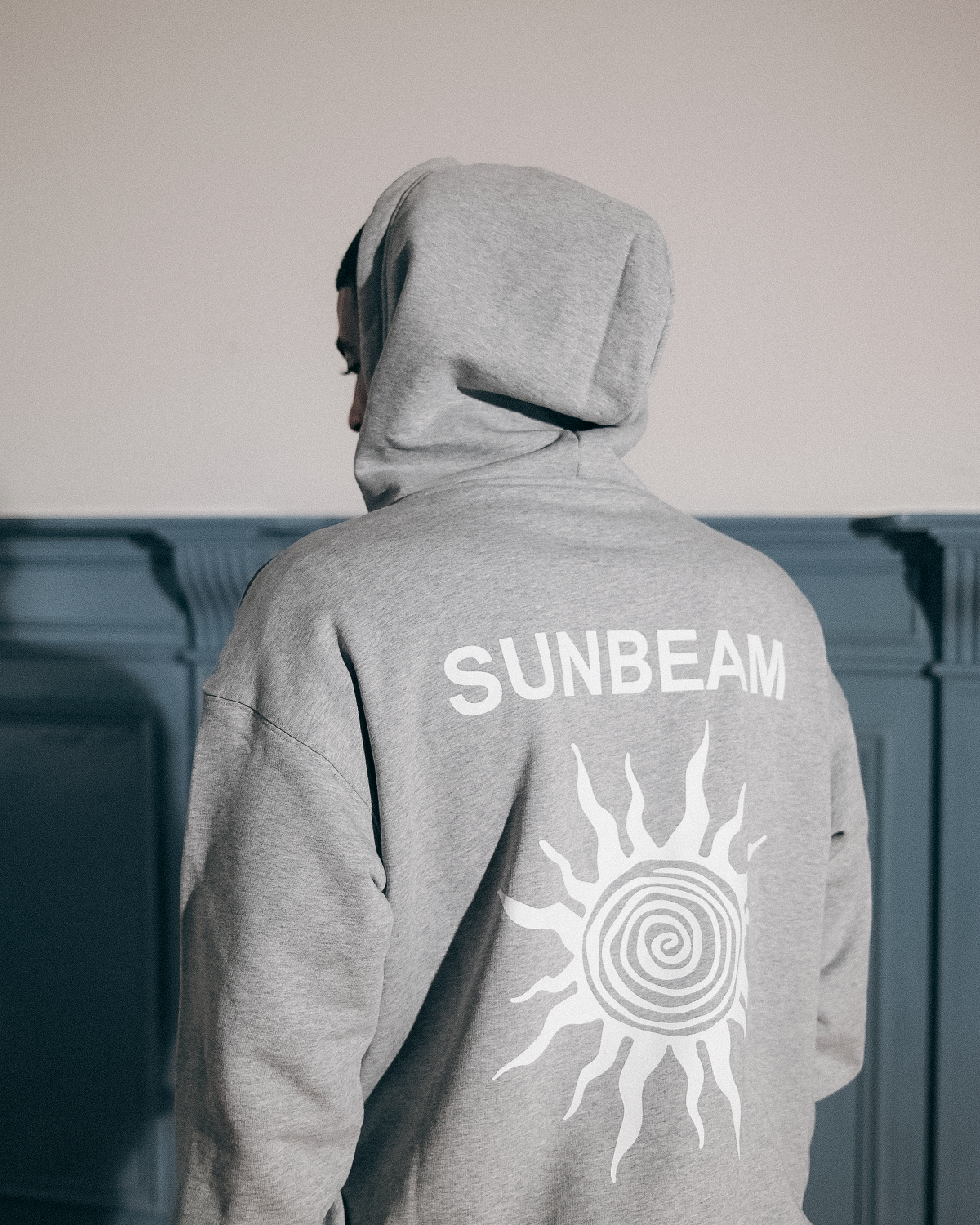 480g heavyweight hoodie made from premium cotton with French terry (loopback) on the inside for durability and comfort. It features an oversized fit with ribbed cuffs and hem for a comfortable, secure feel. A large SUNBEAM logo is featured on the back, while a subtle SUNBEAM sun logo appears on the left wrist. The loopback interior helps maintain the shape over time.